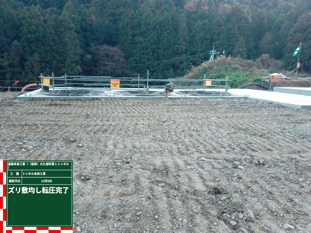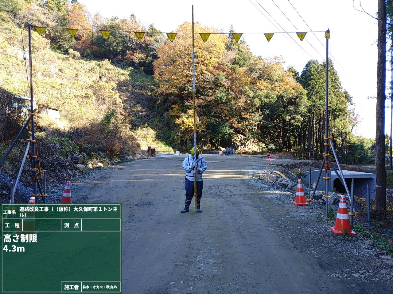 まず、これから工事車両がたくさん往来する場所には、ドライバーさんにしっかり気付いて貰えるよう、高さ制限の”旗”を目立つように設置。