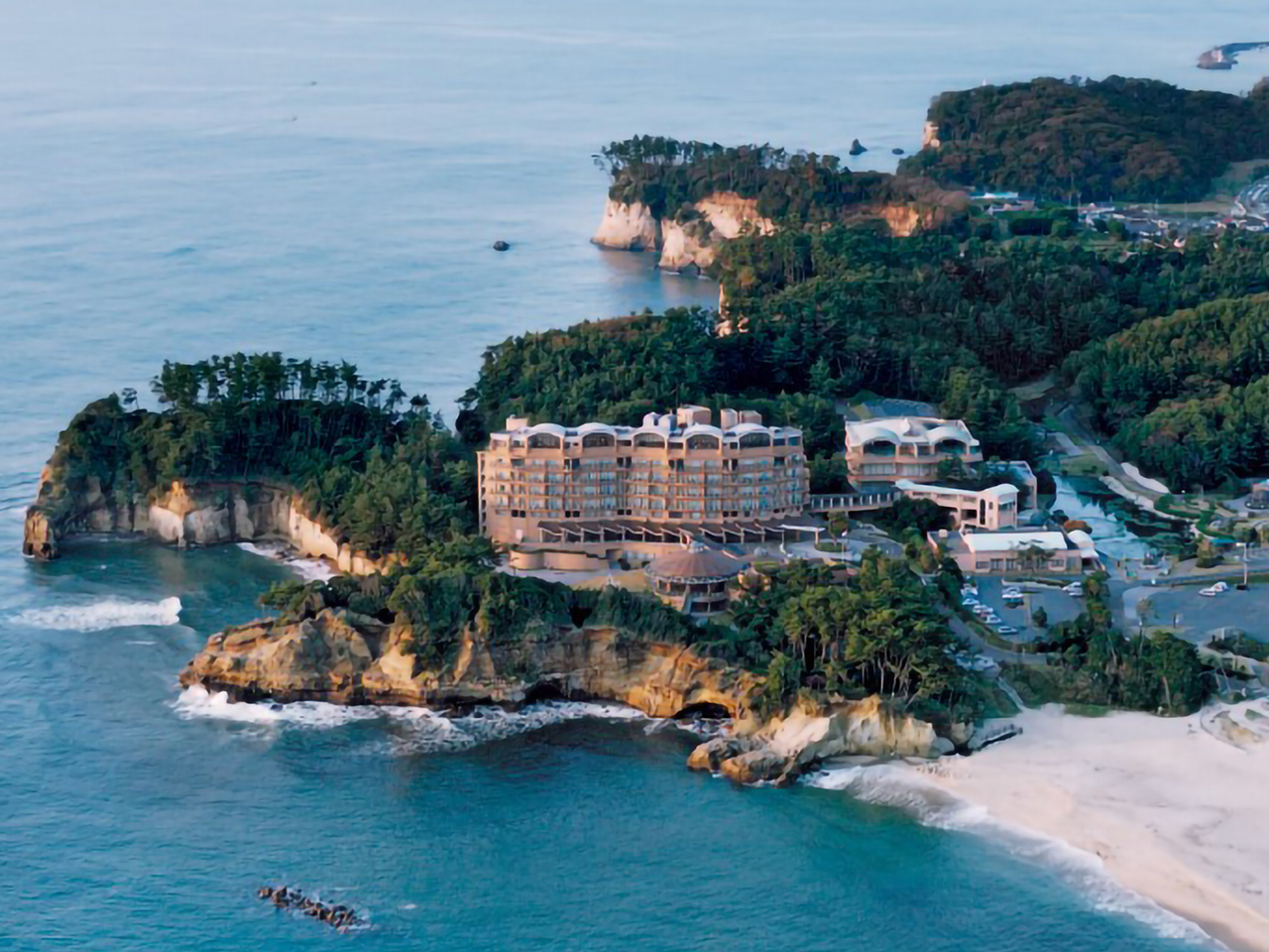 青い海と、白い砂、松林に囲まれて太平洋を一望する岬に建っています。