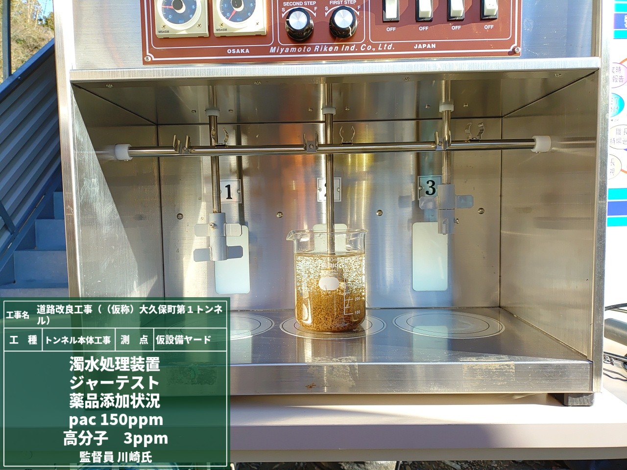 ビーカーに濁水と、量を変えた薬品を投入・撹拌・沈降させて、一番キレイ✨になる薬品量を決めていきます。