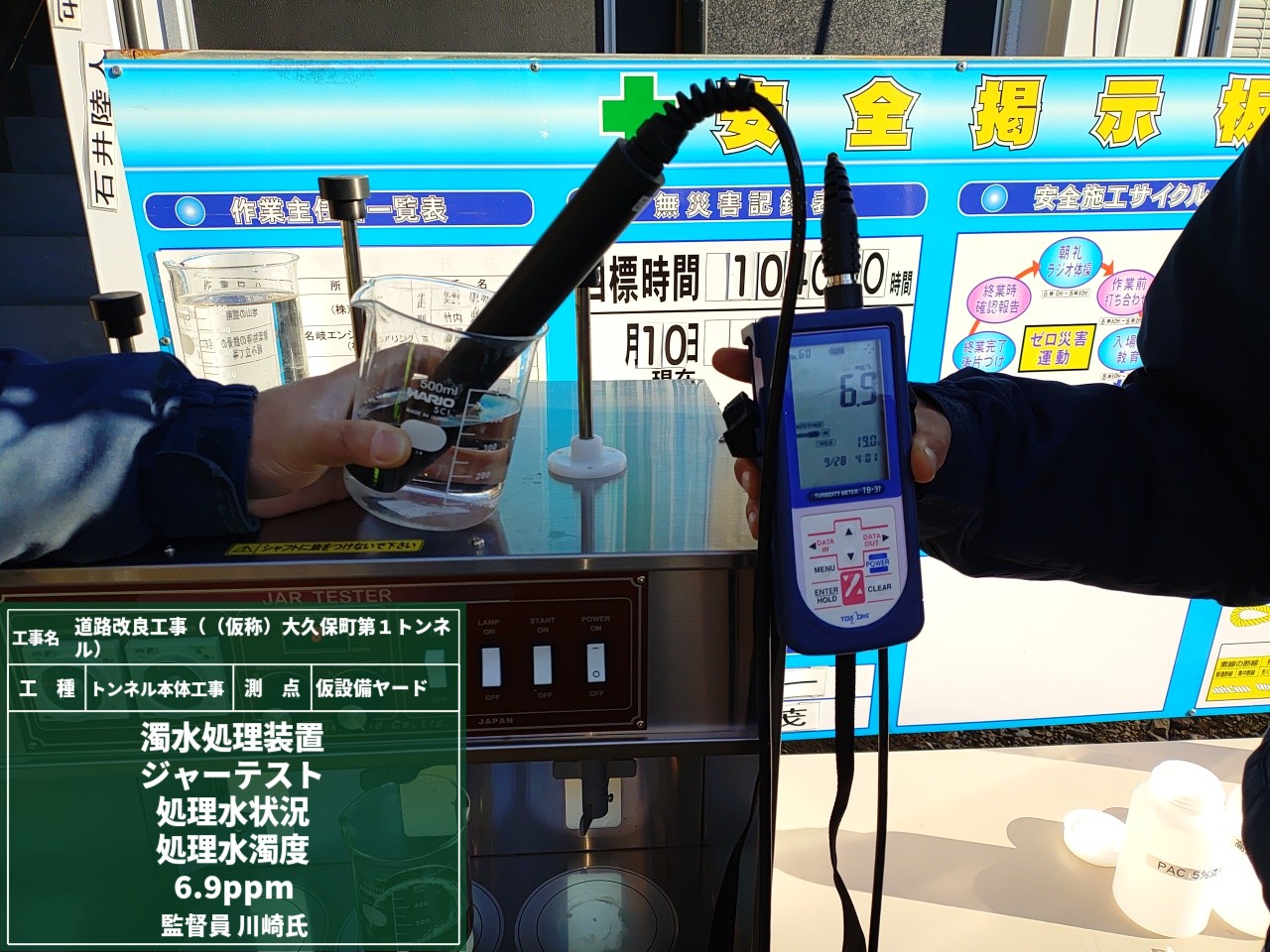 現場で発生する濁水に対して、最適な凝集剤(PACや高分子凝集剤など)の注入量を決めるための現場試験の様子です👇👇👇