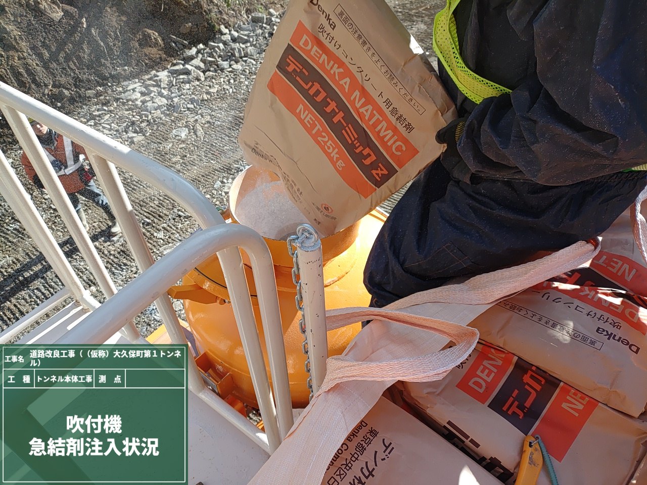 まずはセメントの固まる早さを促進させて、急結させるための吹付コンクリート用の急結剤を注入!